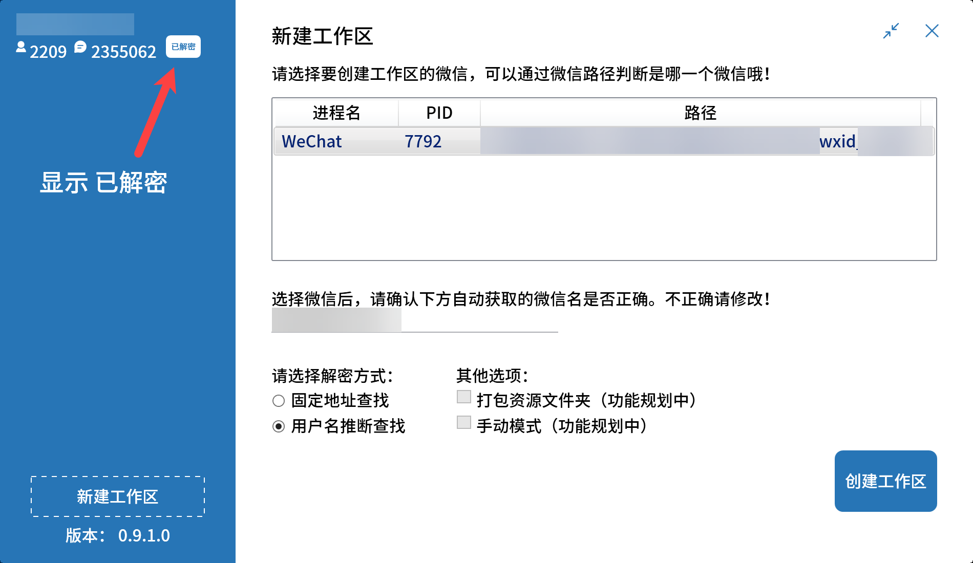 5.新手请忽略其他选项,直接点击创建工作区,程序会自动进行工作区创建、解密。