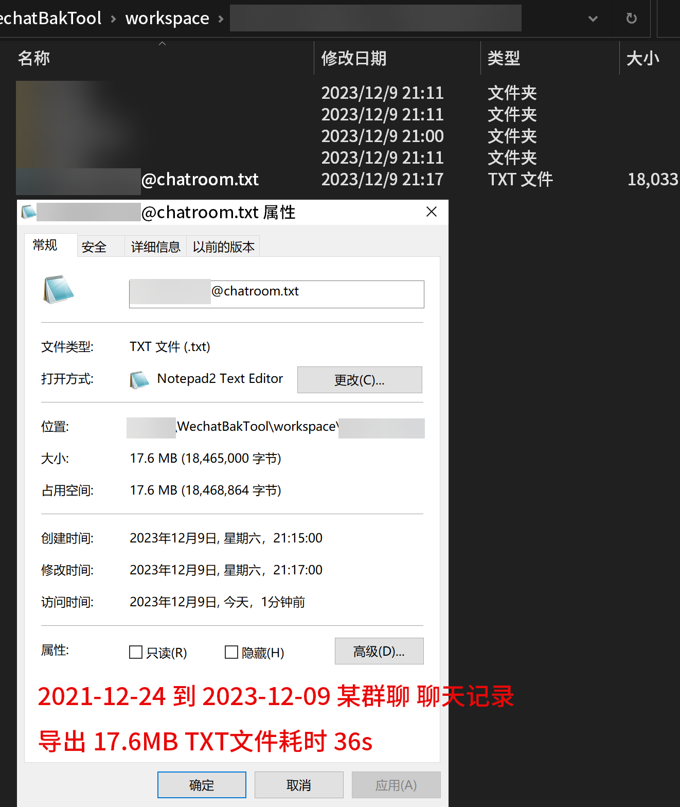 2021年尾 到 2023年尾 近两年 某群聊聊天记录 导出 17.6MB TXT文件耗时 36s(假死36s)