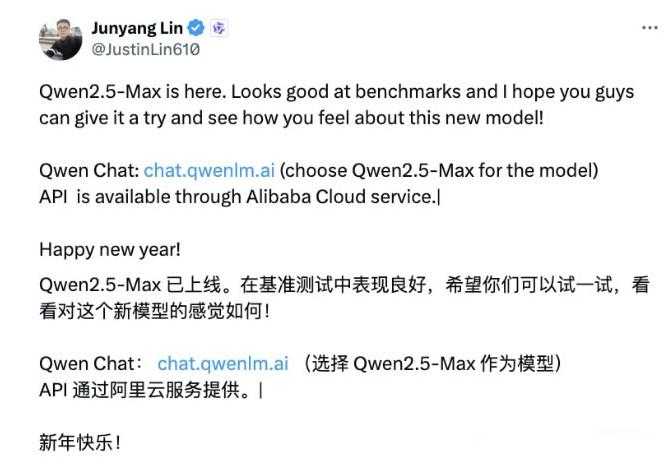 Qwen2.5-Max一发布,高级算法专家林俊旸就发了个圈: