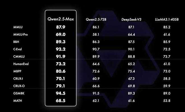 如上图所示,Qwen2.5-Max的各项指标都略高于DeepSeek和LLaMA模型。