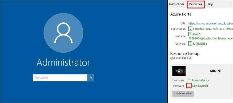 ④在实验室侧边栏上的 资源 或者“resource”选项卡中,在 MININT 框中选择 密码 旁边的 T 图标,往虚拟机里输入密码。
