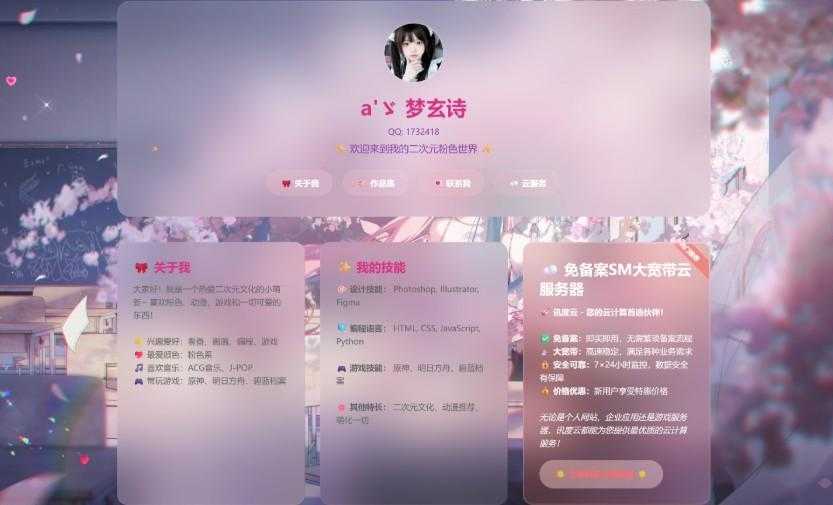 一个精美的粉色二次元风格个人主页,采用现代化的玻璃拟态设计和丰富的动画效果。