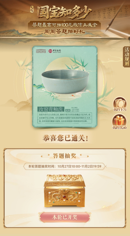 【参与方式】每周可参加1次,打开“中国银行”APP搜索【福仔云游记】进去,点【国宝知多少】进去,3题全部答对抽奖,如果答错了可以反复重新答,非必中