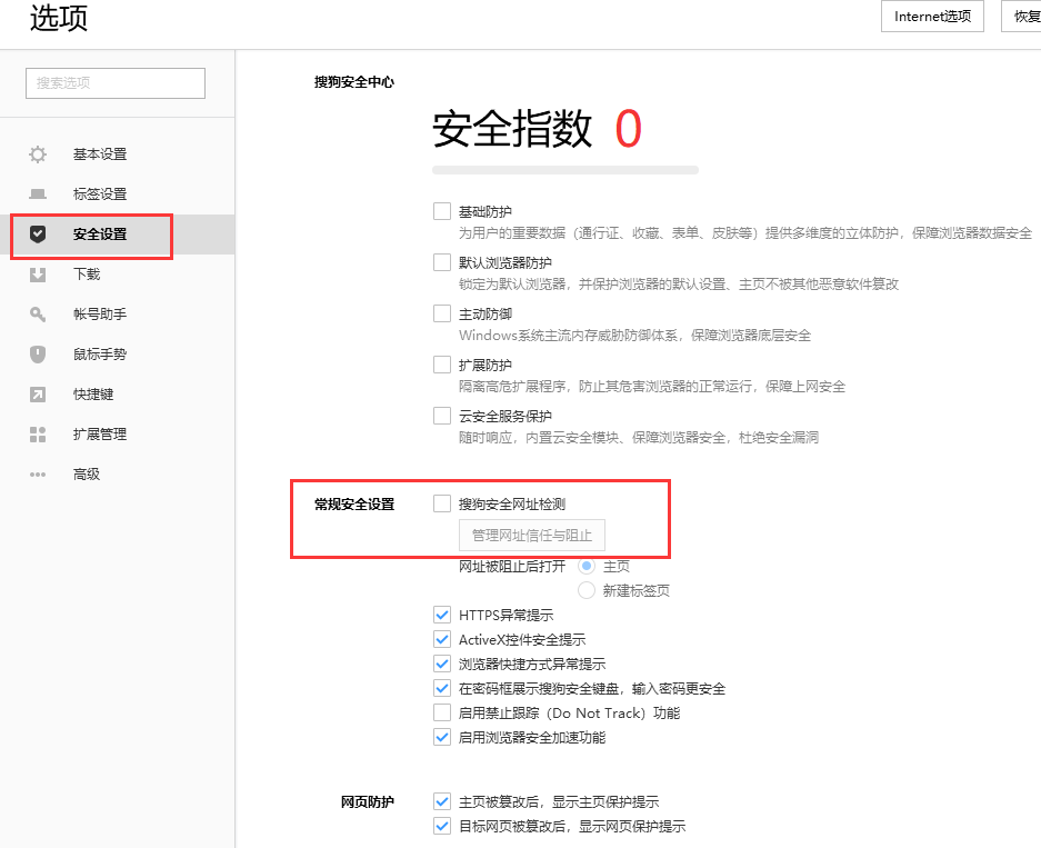 一。点击浏览器右上角的三条杠-选项-安全设置-在常规安全设置-搜狗安全网址检测一栏取消打勾。