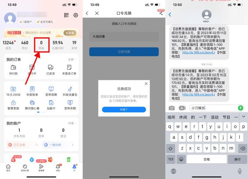 电信APP->我的->我的奖品->输入对应省份的囗令抽话费