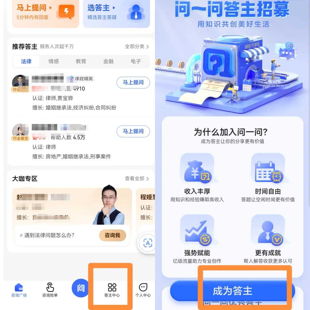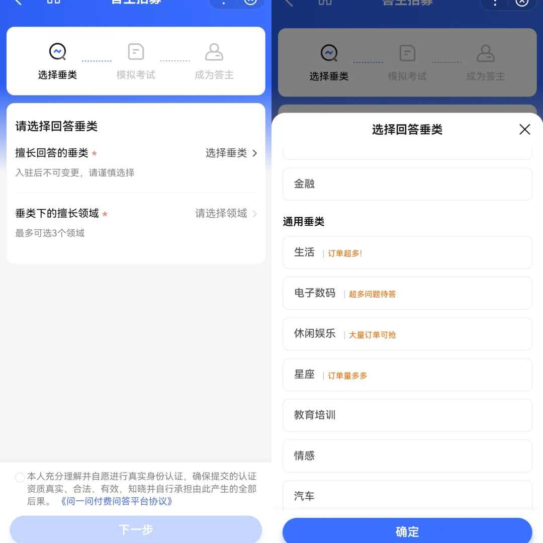 想要获取官方收益,就要先成为答主,在某度APP里搜索问一问,然后点击官方网页,再点击下方菜单栏的答主中心,就进入了申请界面,申请答主时需要选择回答的领域,生活类领域订单比较多,教育类、职场类订单比较少,不过冷门领域单价比较高,同时对于专业性要求也比较高,推荐新手先选择生活类的练手。