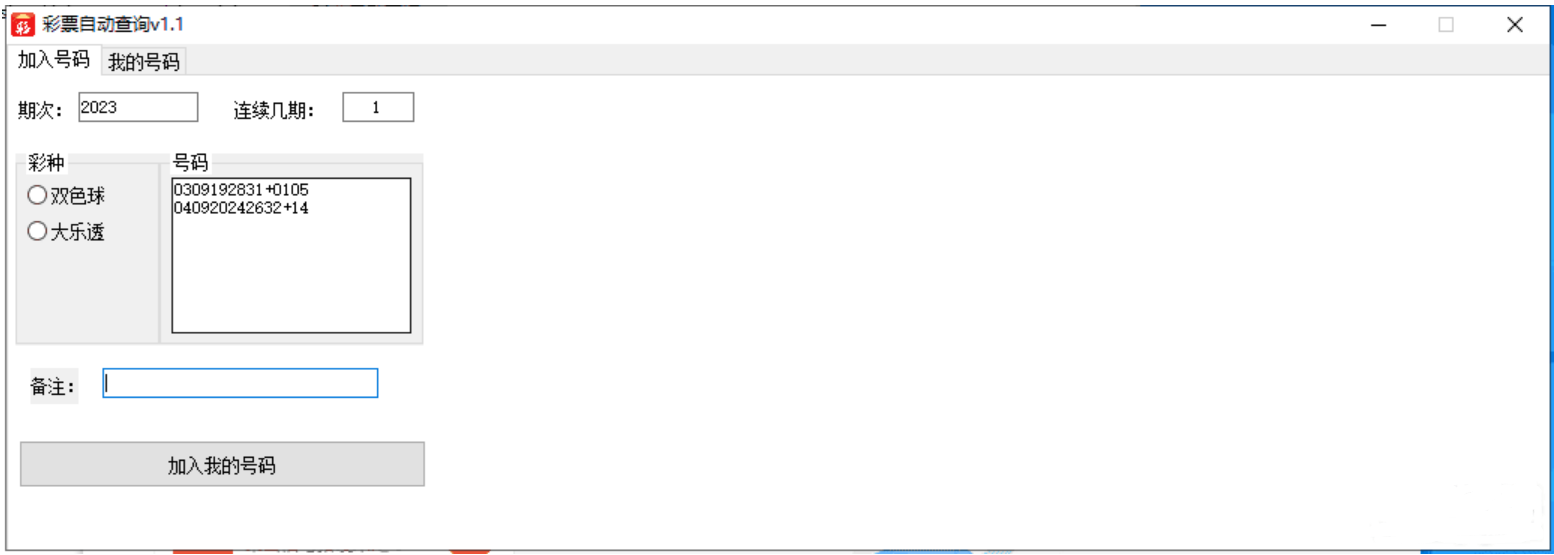 填写【期次】回车,【连续几期】回车,输入号码,选择彩种【加入号码】