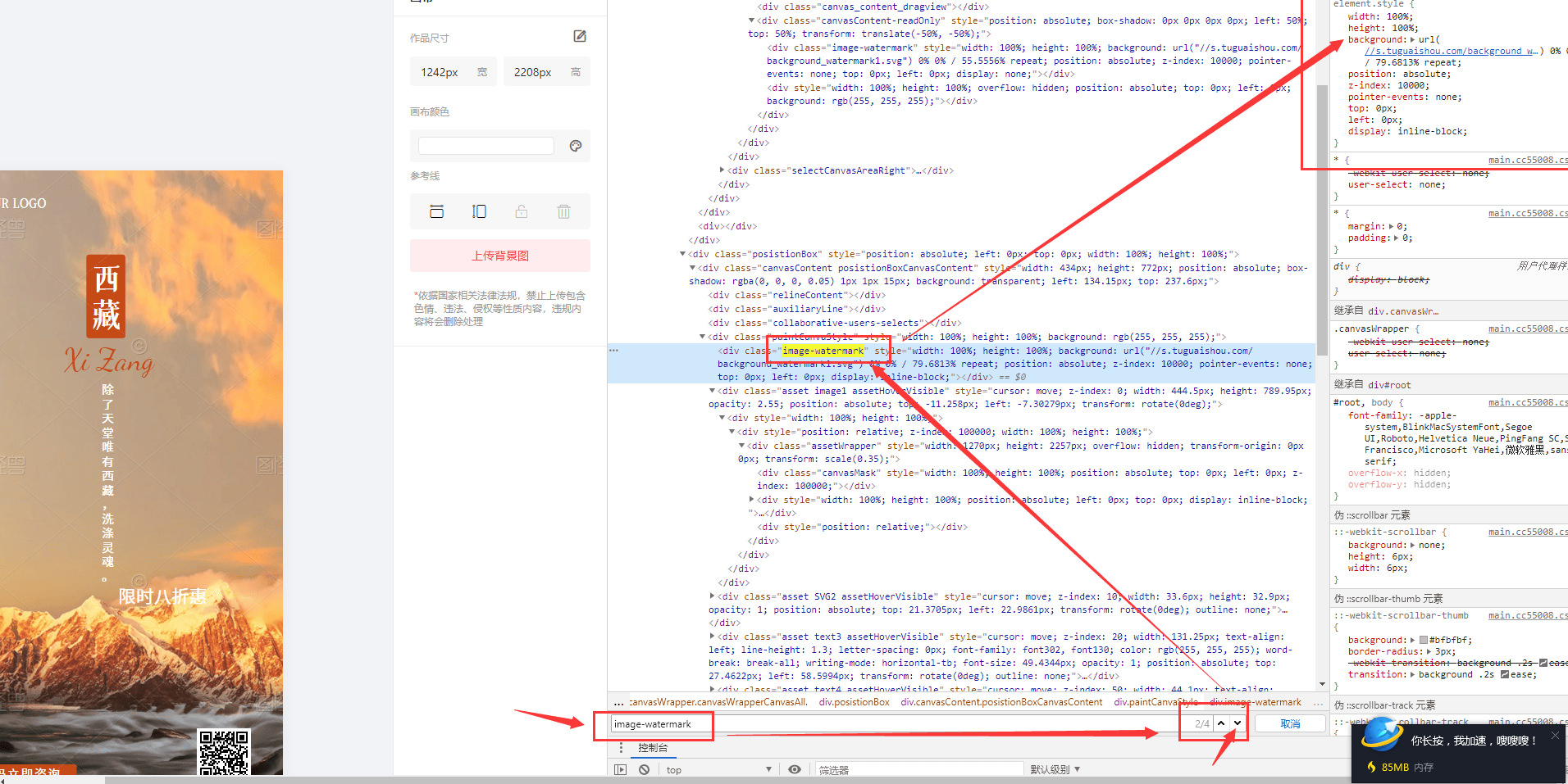 3、如果你的图片已经编辑好了,需要下载,那么系统会提醒你让你加入VIP。如果您对要求不高的情况下,可以按我说的方式进行 先删除水印元素, 然后再网页截图。(一般还是够用了, 如果你电脑显示器分辨率够高,那效果会更好) 水印的标签元素 有一个 class 的名称, 叫做: image-watermark 在代码区域,你ctrl+F5搜索会发现有4个,如下图: