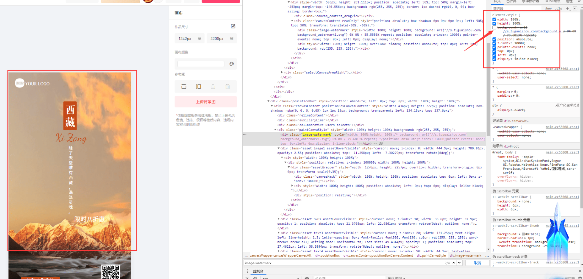 快了快了, 马上就可以成功了, 在这个页面,右侧红色框的是标签的属性 有高、宽等等, 这儿会发现一个很长的 background: url(//s.tuguaishou.com/background_watermark1.svg) 0% 0% / 79.6813% repeat; 这个表示背景图, 我们把他取消即可,如下图: