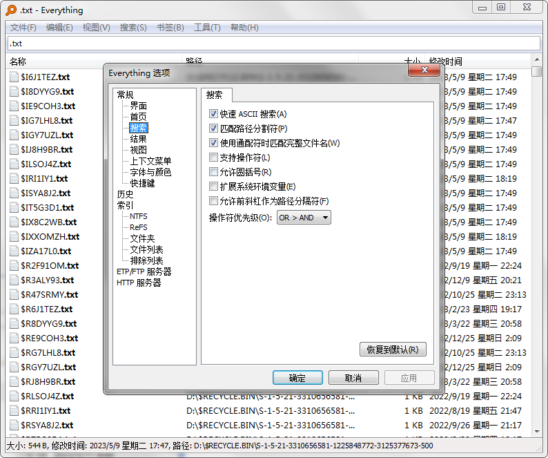 Everything是一个运行于 Windows 系统,基于文件、文件夹名称的快速搜索引擎。Everything在搜索之前就会把所用的文件和文件夹都列出来,这一点与 Windows 自带的搜索系统不一样,所以我们称之为“Everything”。在搜索框输入文字,它就会只显示过滤后的文件和目录。