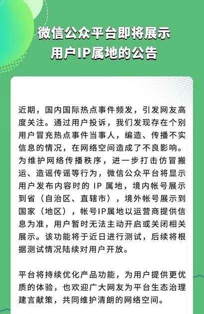 知乎等平台也相继进行了上线据微信官方发布了《微信公众平台即将展示用户IP属地的公告》