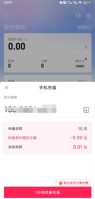 抖音极速版一分购1分冲10元话费