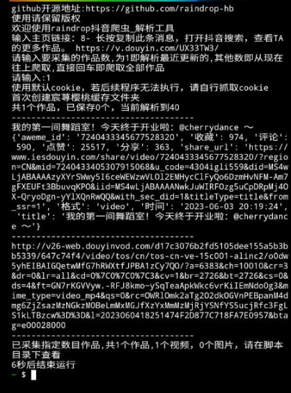 pc:从手机抖音复制别人的主页链接(不要网页复制),打开爬虫软件粘贴进去回车,然后需要爬几个作品就输几,全部就直接回车
