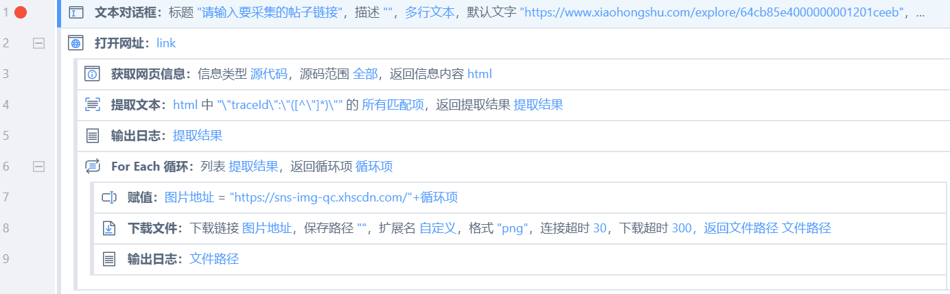 For Each 循环:因为可能获取到的是多个图片 ID,这里需要一个个拆分开挨个下载,当然也有可能只有一个哈