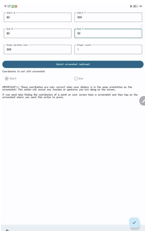 2、点击Record trigger按钮,然后在蓝牙遥控器上按下你要映射的按键,Trigger页面记录上按键后,再点击下面的Add action按钮,选择要映射的功能,我想映射的是向上滑动屏幕,选择的是Swipe Screen,设置如下图最右边那张图,把滑动起点和终点位置输入好点击那个 勾勾 保存就OK了。