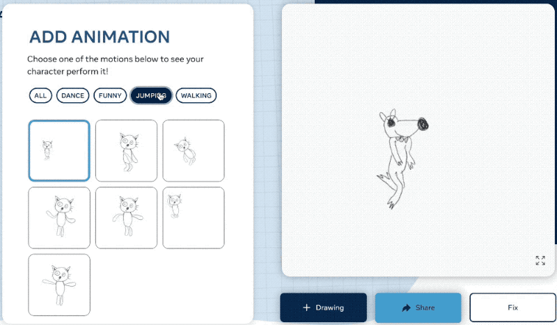 上传绘图后,用户可以选择调整检测到的边界框、分割蒙版和关节位置,并选择一个动作来制作动画。