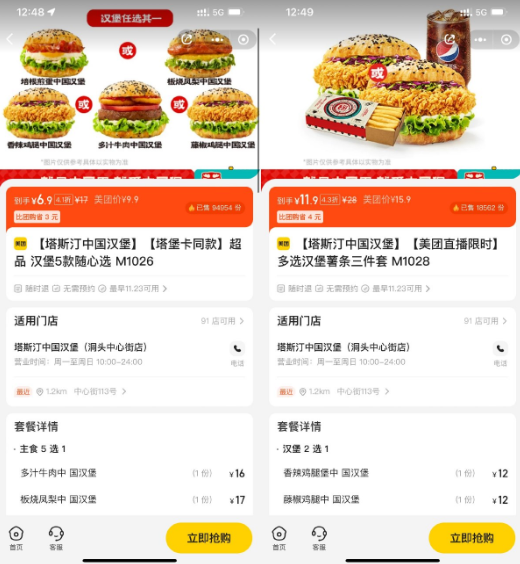 微信打开地址->6.9亓任选塔斯汀汉堡 或11.9亓塔斯汀汉堡薯条可乐,全国门店都可以用,到店核销即可使用,刚好要吃的可以看看