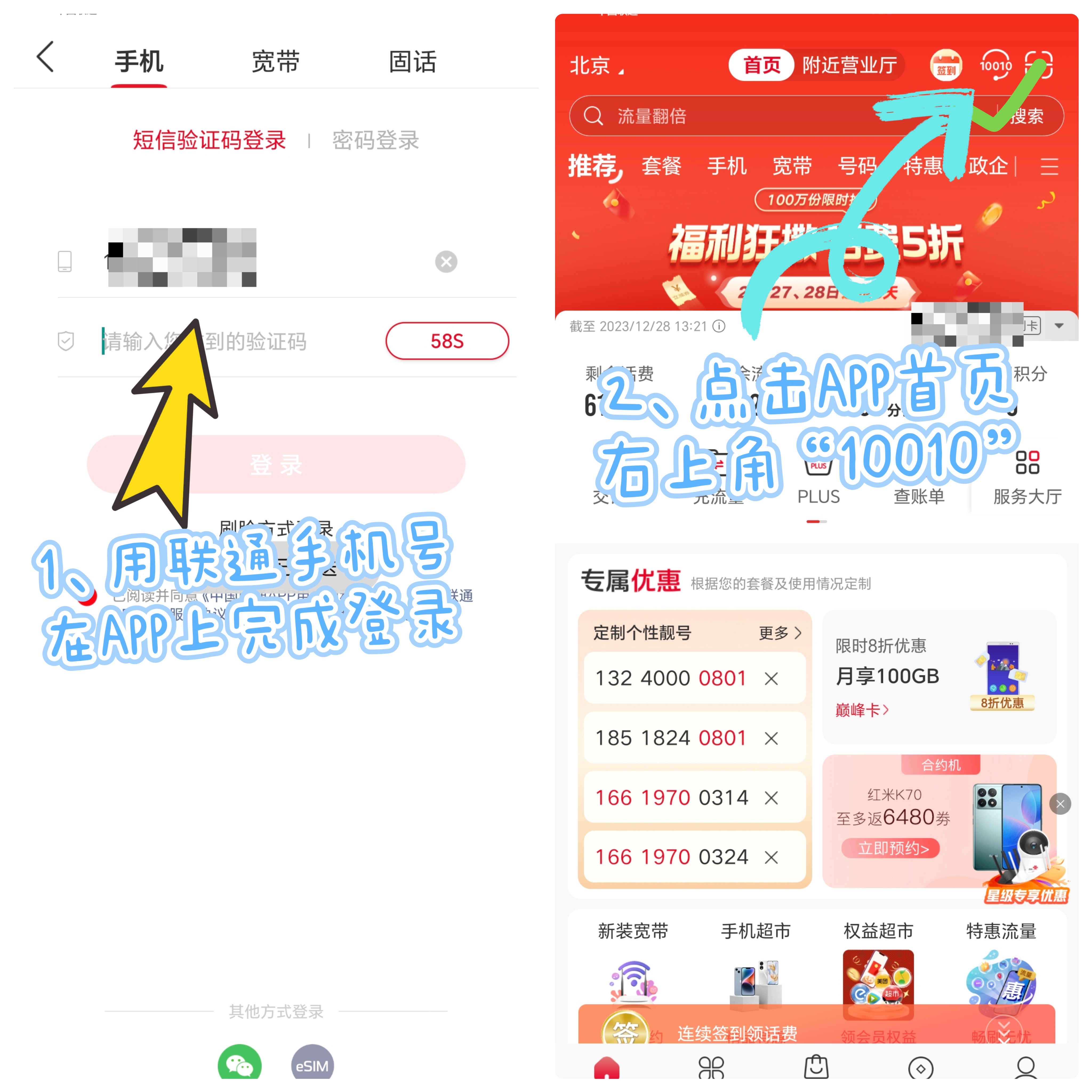 进入联通APP后,用户输入上一步【立即参与】联通手机号登录,并在APP首页右上角找到“10010”在线客服入口。
